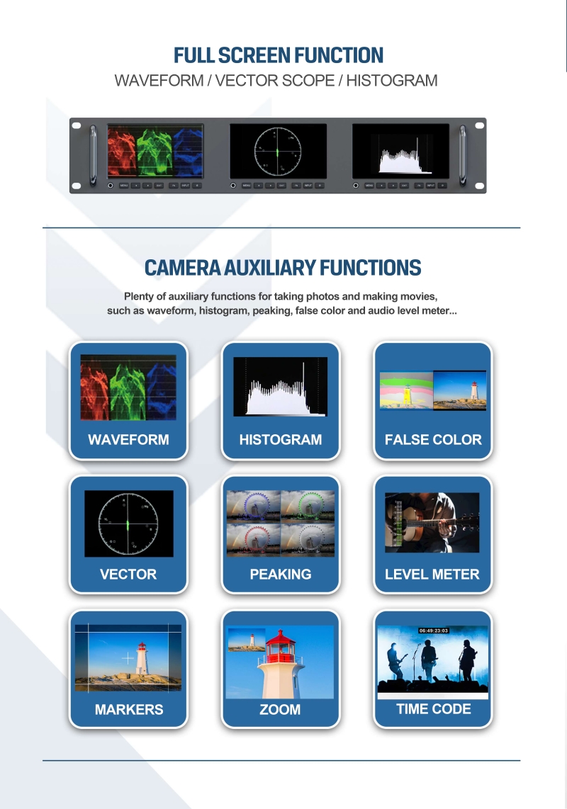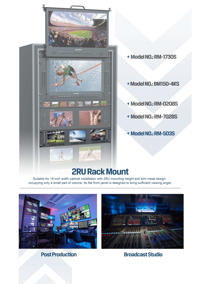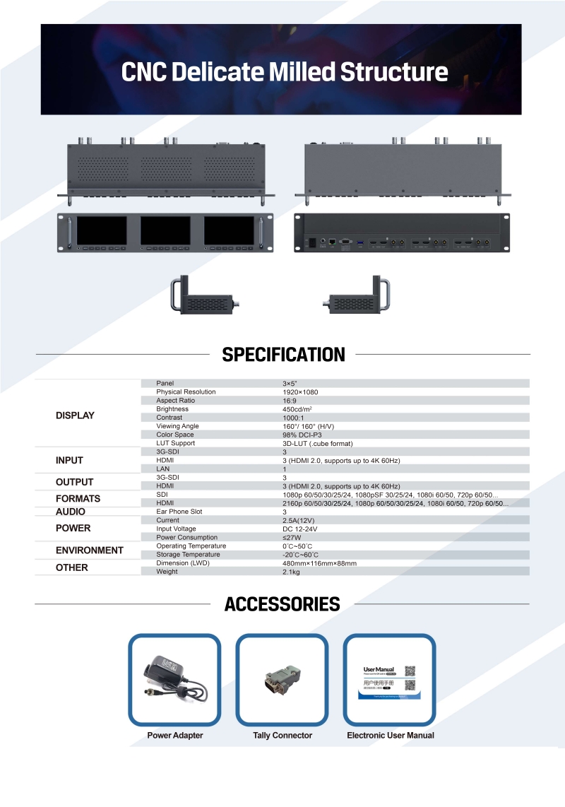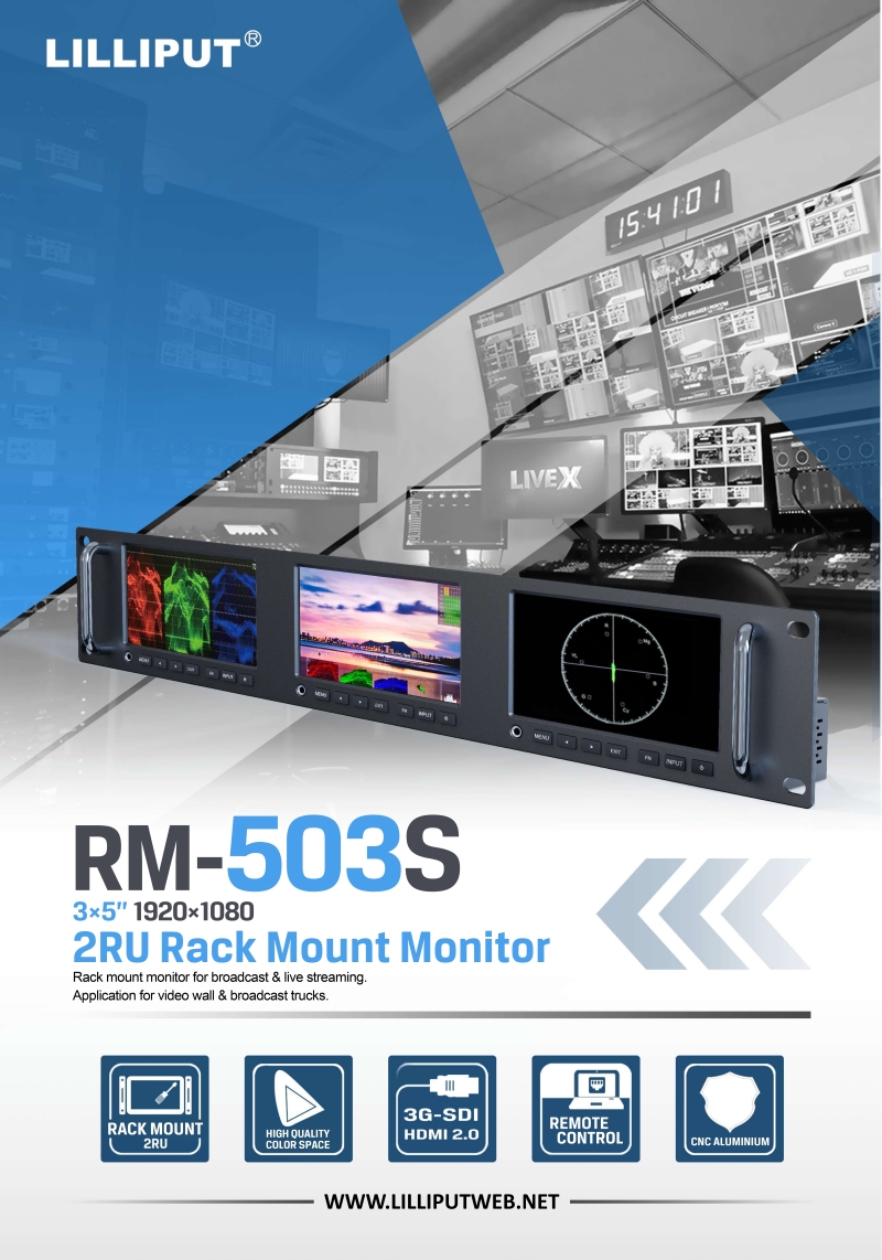 RM-503S 5" monitor 3G-SDI/HDMI od spoločnosti Lilliput je vybavený tromi 5" LED displejmi, každý s jasom 450 cd/m² a rozlíšením Full HD 1920 x 1080. Kovové šasi s možnosťou montáže do racku 2 RU má dve zabudované rukoväte, ktoré uľahčujú montáž a demontáž z vašej videosteny alebo mobilného vysielacieho systému. Vďaka integrovanej 3D LUT a podpore HDR je model RM-503S prispôsobený pre aplikácie vysielania, postprodukcie a živého vysielania.
