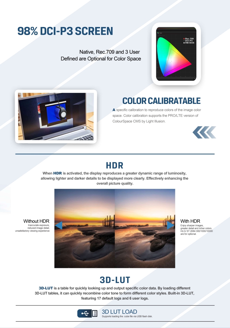 RM-503S 5" monitor 3G-SDI/HDMI od spoločnosti Lilliput je vybavený tromi 5" LED displejmi, každý s jasom 450 cd/m² a rozlíšením Full HD 1920 x 1080. Kovové šasi s možnosťou montáže do racku 2 RU má dve zabudované rukoväte, ktoré uľahčujú montáž a demontáž z vašej videosteny alebo mobilného vysielacieho systému. Vďaka integrovanej 3D LUT a podpore HDR…