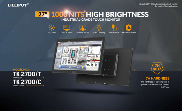 Lilliput TK2700-NP/C je 27-palcový kovový monitor – najväčší z radu kovových monitorov TK – vybavený 10-bodovým kapacitným dotykovým displejom a obrazovkou s vysokým jasom 1000 nitov. Možnosti vstupu zahŕňajú HDMI, VGA a – pre staršie typy video signálov – podporuje aj RCA / kompozitný vstup. Panel je vyrobený špeciálne pre tento model monitora a je vybavený antireflexnou vrstvou, úpravou proti odtlačkom prstov, aby odolával zakaleniu od ľudí, ktorí sa dotýkajú monitora, a odolnosťou proti UV žiareniu pre jasné videnie vonku. Fyzické vlastnosti zariadenia sú impozantné a sú navrhnuté pre použitie na verejnosti. Podporuje dotykové ovládanie v rukaviciach, má predný panel odolný voči vode a prachu s certifikáciou IP65/NEMA 4, tvrdosť 7H a odolnosť voči nárazom IK07, čo z neho robí pevný a odolný monitor.