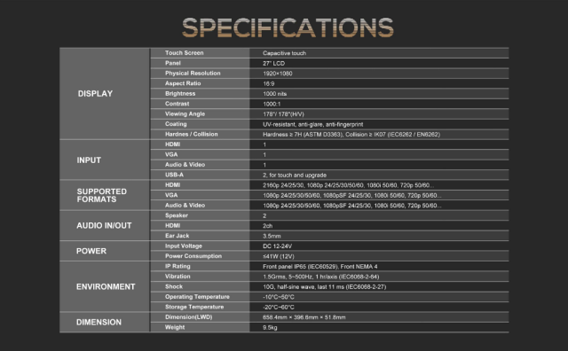 Lilliput TK2700-NP/C je 27-palcový monitor s kovovým rámom a 10-bodovým kapacitným dotykovým displejom s vysokou jasnosťou 1000 nitov, vybavený vstupmi HDMI, VGA a RCA/Composite, antireflexnou/antiprstovou/UV odolnou vrstvou, dotykovou funkciou kompatibilnou s rukavicami, odolnosťou proti vode a prachu na prednom paneli…