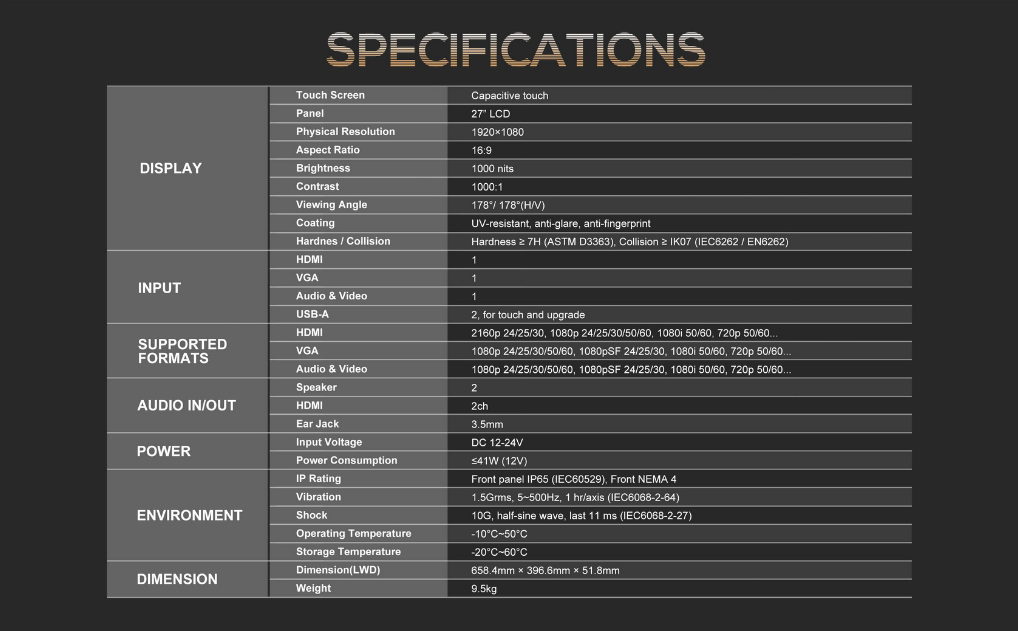 Lilliput TK2700-NP/C je 27-palcový monitor s kovovým rámom a 10-bodovým kapacitným dotykovým displejom s vysokou jasnosťou 1000 nitov, vybavený vstupmi HDMI, VGA a RCA/Composite, antireflexnou/antiprstovou/UV odolnou vrstvou, dotykovou funkciou kompatibilnou s rukavicami, odolnosťou proti vode a prachu na prednom paneli IP65/NEMA 4 tvrdosťou povrchu 7H a ochranou proti nárazom IK07, vďaka čomu je ideálny pre inštaláciu vo verejných priestoroch.