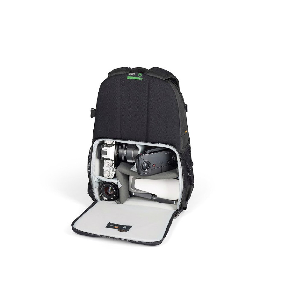Je navrhnutý tak, aby sa do neho zmestili bezzrkadlové fotoaparáty s crop senzorom, ako sú Fujifilm XT200, Canon M50 MII, EOS R10 alebo Nikon Z50 s nasadeným objektívom, a pojme aj 2–3 ďalšie objektívy, nabíjačku alebo dokonca kompaktný dron, ako je Mavic Air. Špeciálny priestor na fotoaparát má zadný prístup s flexibilnými priehradkami, ktoré zabezpečujú, že výbava zostane v bezpečí a ľahko dostupná.