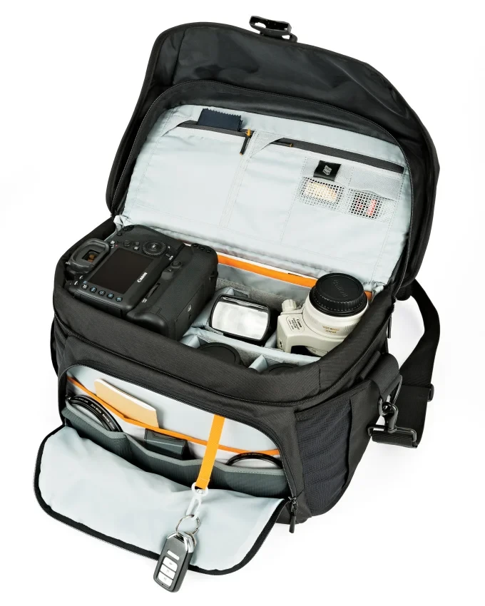 Přední oddíl má tři vnitřní kapsy ideální pro filtry nebo krytky objektivů, stejně jako prostor pro manuál nebo malou knihu. Na přední straně víka je další kapsa na zip, kterou lze použít pro každodenní předměty, jako je telefon, peněženka nebo klíče.