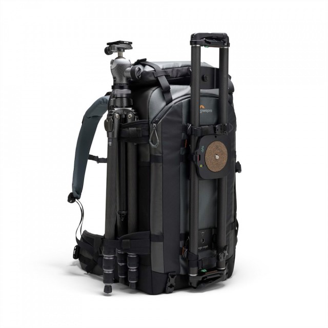 Vďaka systému slučiek, dvojici priložených príslušenstiev a zasúvateľnému držiaku statívu so zipsovým krytom v prednom vrecku je možná krížová funkčnosť a individuálna konfigurácia. Ak potrebujete prenášať dva statívy alebo uprednostňujete bočné upevnenie, na boku batohu sú špeciálne popruhy na statív. Predná a bočná časť sú navrhnuté tak, aby pojali širokú škálu statívov, vrátane modelov až do veľkosti Gitzo Systematic.