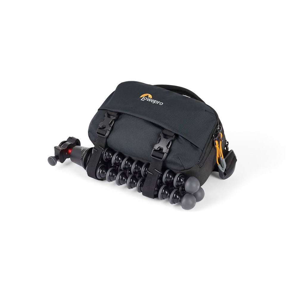 Kompresný systém UltraCinch pomáha stabilizovať vašu výbavu počas pohybu. Jednoducho natiahnite elastický popruh okolo fotoaparátu a výbavy, aby všetko zostalo na svojom mieste. Predné vrecko má organizér a klip na kľúče.
