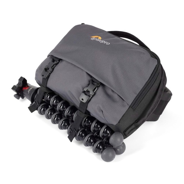 Vpredu je malé vrecko na zips na kľúče, telefón alebo iné drobnosti; a hlavný zips umožňuje prístup k priehradke na fotoaparát. Dvojica popruhov umožňuje pripevniť stolový statív alebo bundu na spodný predný panel. Na vnútornej strane brašne nájdete príslušenstvo v podobe držiaka na fľašu s vodou, ktorý možno použiť spolu s popruhmi.