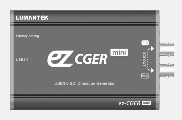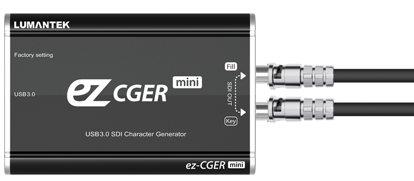 Vďaka veľkosti miniatúrneho konvertora a jednoduchému pripojeniu USB 3.0 generuje ez-CGER mini Fill & Key vo formáte SDI. Pripojte ich k vlastnému video prepínaču a vysielajte naživo svoje video pomocou CG! Vkladajte obrázky, videá, textové súbory a ďalšie súbory pomocou špecializovaného softvéru ez-CGER od spoločnosti LUMANTEK.
