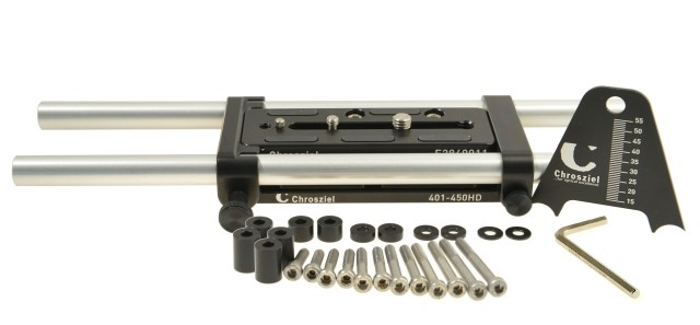 LWS - Light Weight Support 15 HD Allround, Ø 15 mm, dĺžka tyče 310 mm, dvojité vedenie tyče a svorka, nastaviteľná pre akúkoľvek kameru s optickou výškou medzi 26,5 a 72,5 mm (vzdialenosť medzi stredom objektívu a spodkom kamery). Súčasťou sú dištančné podložky (páry) 1, 2, 4, 8, 2 x 16 mm, sada skrutiek, tabuľka s výškami fotoaparátu a imbusový kľúč. (Alternatívne možno použiť všetky platformy kamier Chrosziel série 401-4xx.)