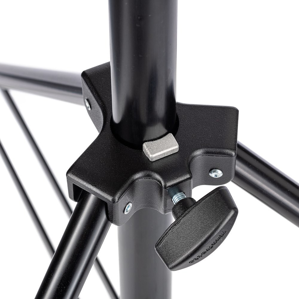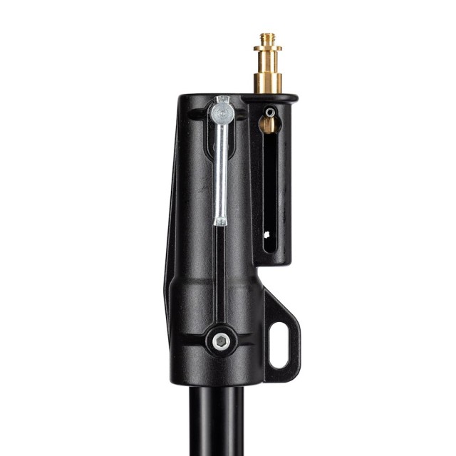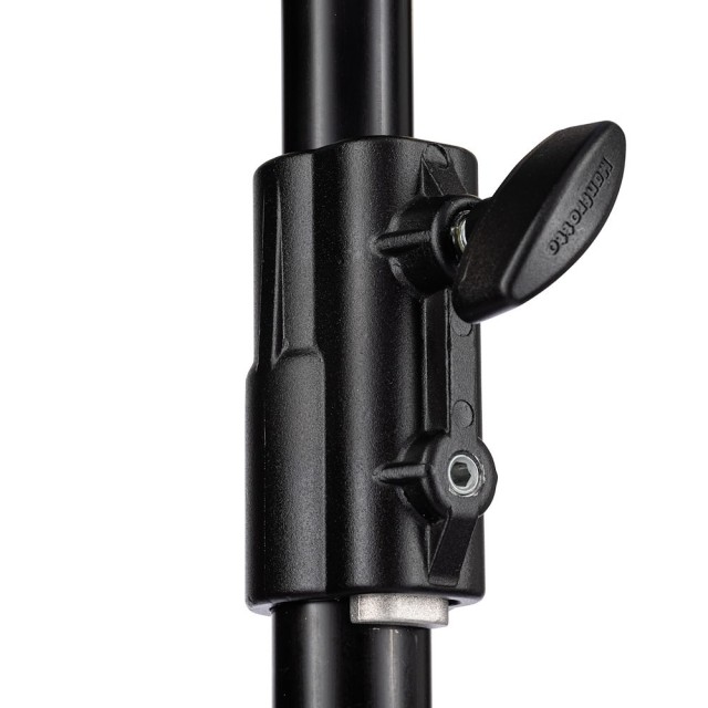 Obsahuje vyrovnávaciu nohu, ktorá umožňuje stabilné použitie na nerovných povrchoch, vrátane schodov alebo svahov. Stojan unesie maximálne zaťaženie 15 kg a dá sa vysunúť až na 212 cm, pričom v zloženom stave má dĺžku 112 cm, čo uľahčuje skladovanie a prepravu. Dvojité možnosti upevnenia na hornej časti – 1 1/8" (28 mm) samica a 5/8" (16 mm) samec – zaručujú kompatibilitu s širokou škálou osvetľovacích hláv a príslušenstva.