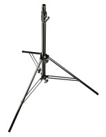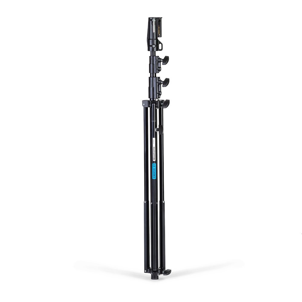 Manfrotto 007BUAC Black Air Cushioned Aluminium Senior Stand je odolný, prenosný 3 kg hliníkový statív s 3-dielnymi vzduchovými výškovými nohami, s výškou 124–315 cm a nosnosťou 12 kg (2,5 kg pri maximálnom vysunutí) s dvojitými výstuhami nôh, univerzálnou 28 mm objímkou + 16 mm čapom + 3/8" skrutkovou hlavou, jednou vyrovnávacou nohou a odporúčanými kolieskami, ktoré poskytujú pevnú stabilitu pre lokálne alebo štúdiové osvetlenie, modifikátory alebo kamery.