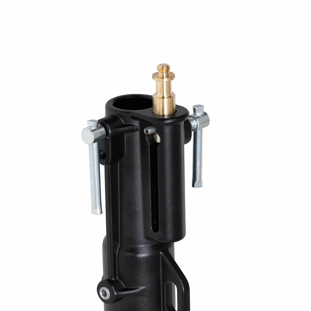 Manfrotto 298B kombinuje širokú čiernu oceľovú základňu (s tromi uzamykateľnými kolieskami a jednou nastaviteľnou vyrovnávacou nohou) a tri strieborné hliníkové časti, ktoré sa pomocou dvoch zdvihov hladko predĺžia na 300 cm. Obdĺžnikové oceľové nohy sa dajú pre transport zložiť, zatiaľ čo vyrovnávacia noha kompenzuje nerovnosti podlahy až do ±15°. Vrchná časť je vybavená odnímateľným 5/8" (16 mm) baby štandardom a 3/8"-16 závitom (k dispozícii je redukcia 1/4"-20), čo je ideálne pre portrétne štúdiá, video štúdiá alebo prenájomné súpravy, ktoré potrebujú stabilný stojan na kolieskach, ktorý unesie 15 kg v blízkosti alebo 5 kg v plnej výške – spoľahlivá odolnosť pre každodenné profesionálne použitie.