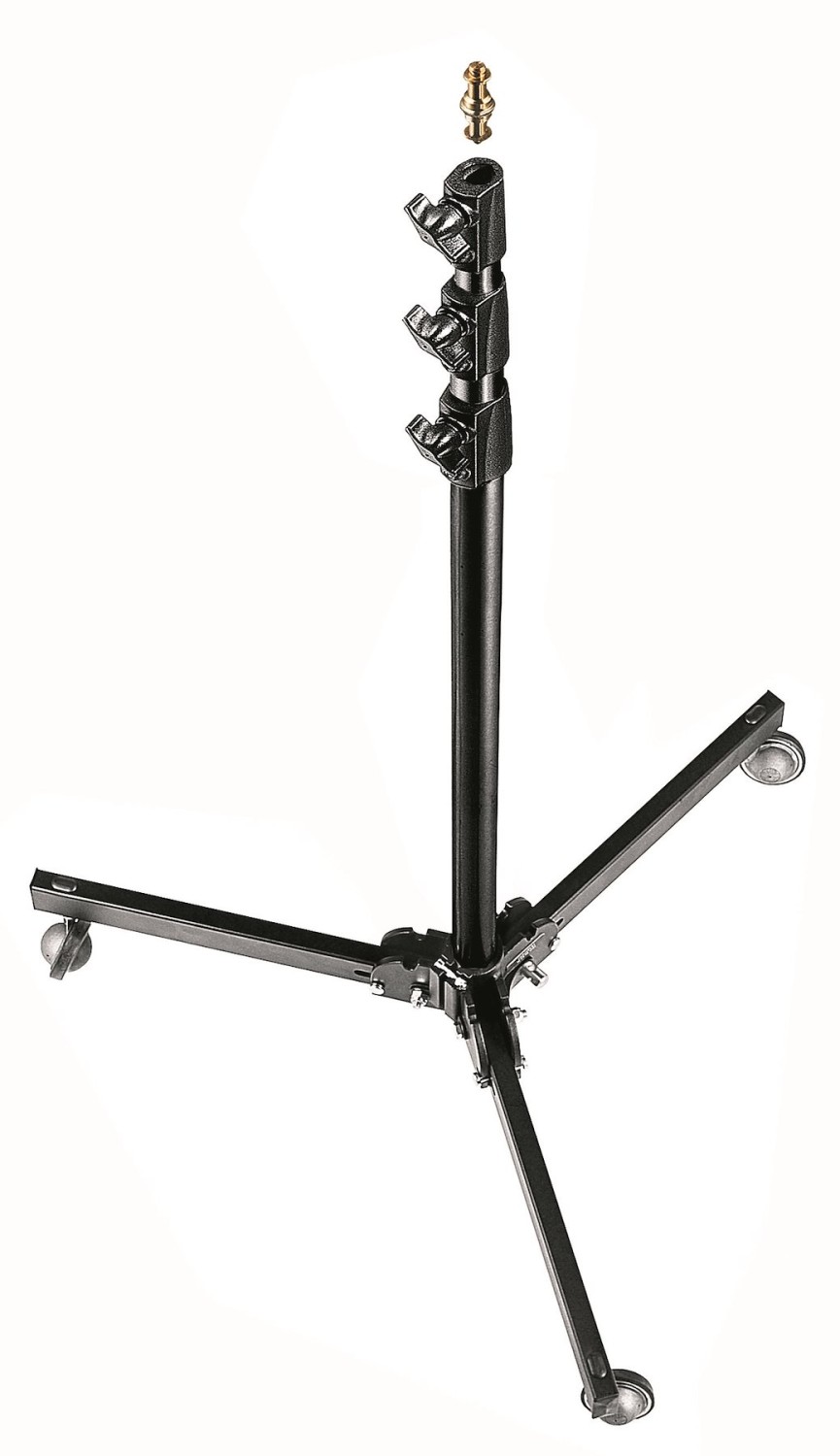 Manfrotto 299B kombinuje ťažkú čiernu oceľovú pavúkovú základňu s tromi ľahkými hliníkovými sekciami a dvoma stúpačkami. Obdĺžnikové nohy poskytujú mimoriadnu bočnú stabilitu, vyrovnávacia noha kompenzuje nerovnosti podlahy a vysokokvalitné 80 mm brzdené kolieska umožňujú plynulé premiestňovanie bez zdvíhania. V hornej časti sa nachádza 17,5 mm objímka a 3/8″ a 1/4″ závity, plus klasický adaptér Manfrotto Art. 013 Baby-to-Junior, ktorý je zvyčajne súčasťou balenia. S hmotnosťou 4,8 kg sa ľahko presúva, ale pri skutočnom zaťažení v štúdiu je pevný ako skala.