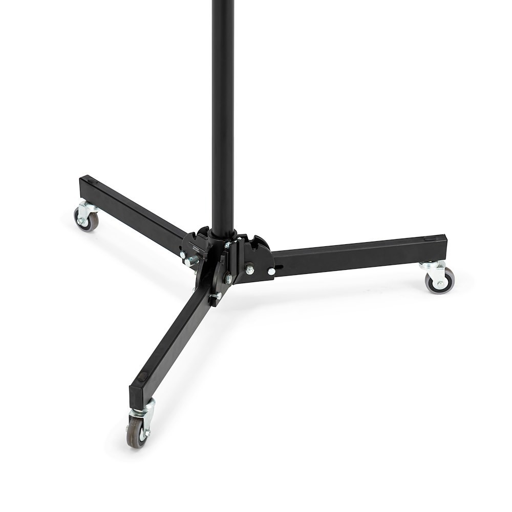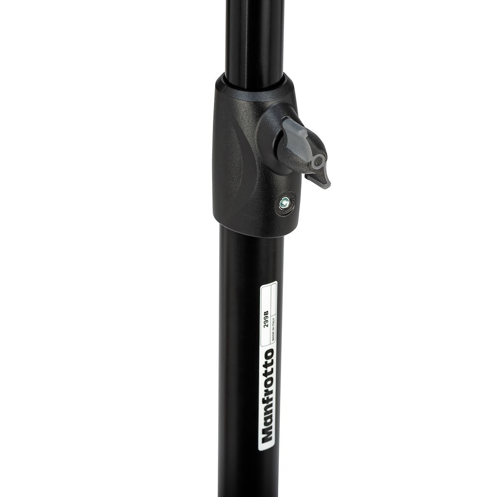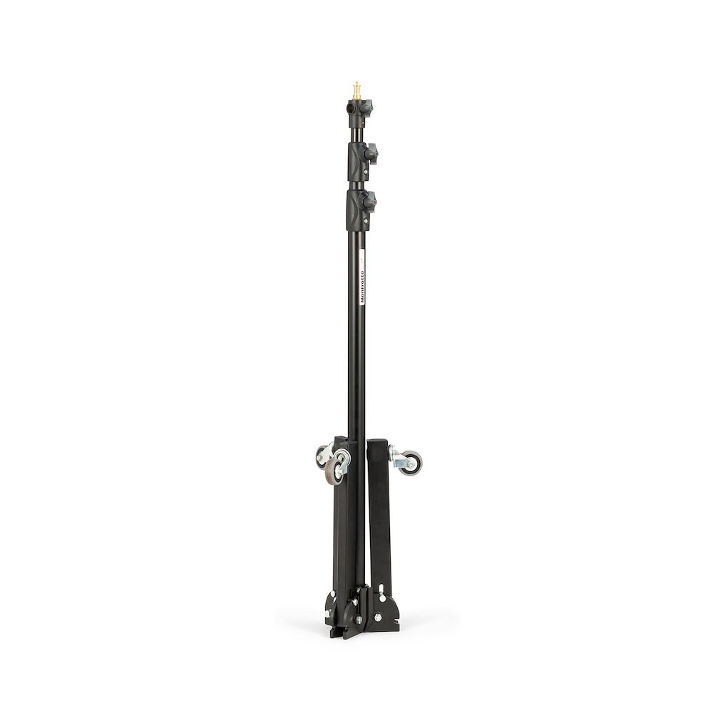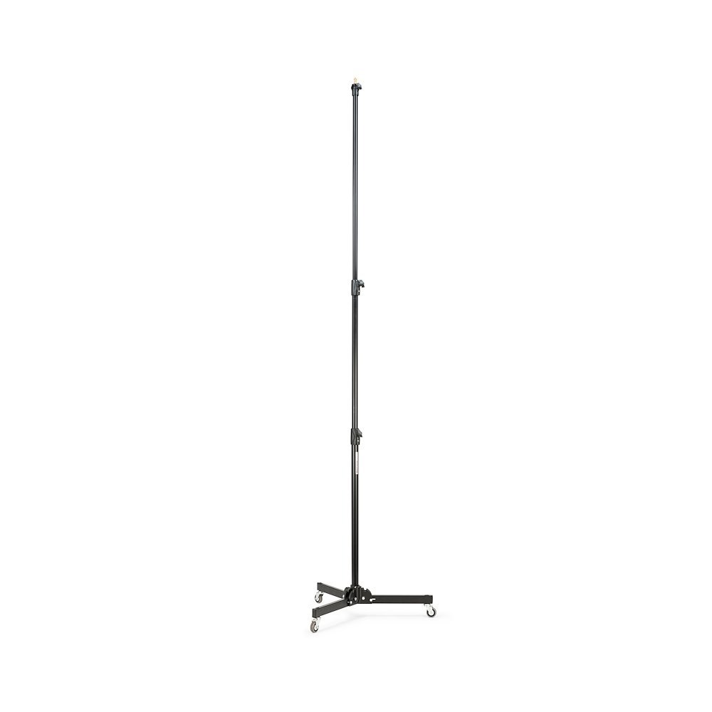 Manfrotto 299B je klasický čierny oceľový stojan s nízkou základňou, striebornými eloxovanými hliníkovými stúpačkami, brzdnými kolieskami a jednou vyrovnávacou nohou – dosahuje výšku 272 cm a bezpečne unesie 12 kg (2,2 kg pri plnom vysunutí). Vďaka širokej, stabilnej základni a vstavaným kolieskam je ideálnym štúdiovým stojanom pre osvetlenie zhora, veľké softboxy alebo podpery pozadia.