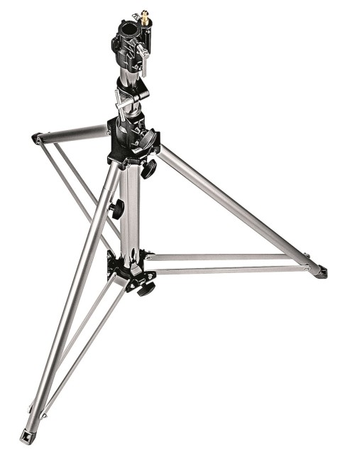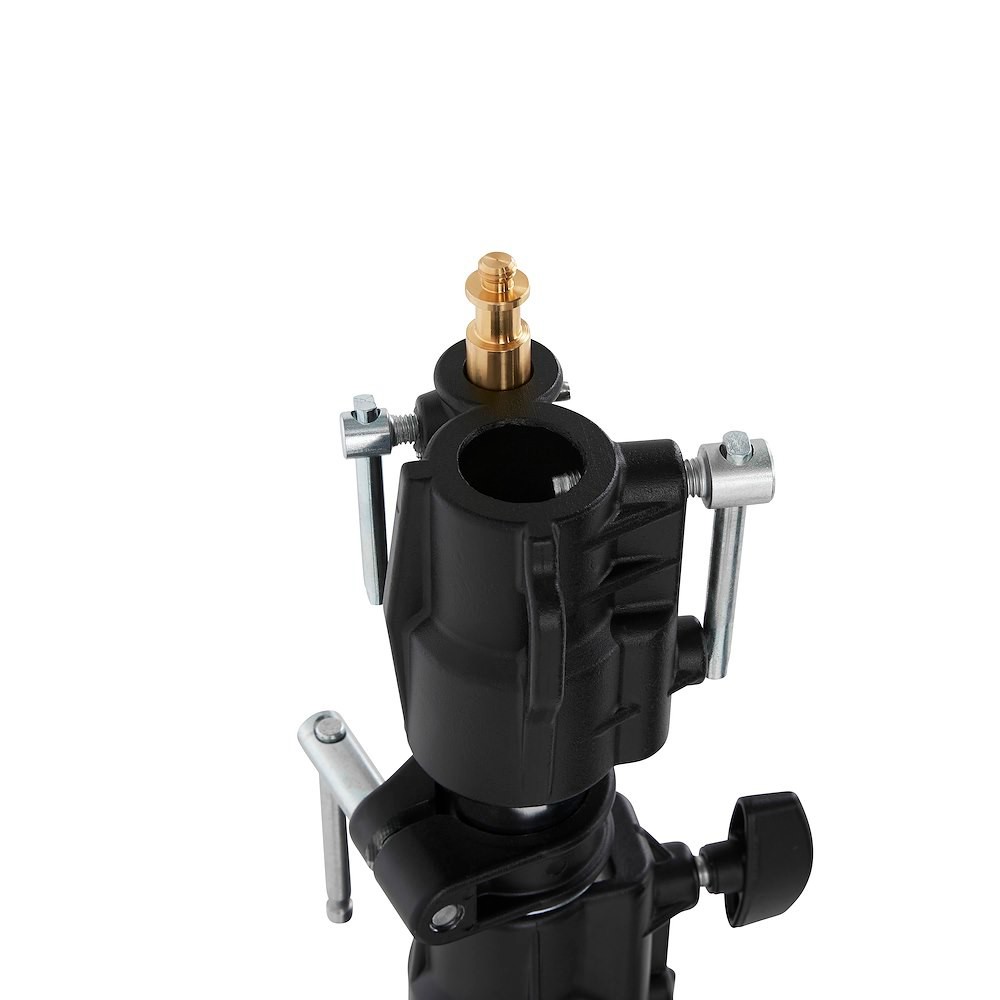 Manfrotto 070CSU je klasický stojan, ktorý nájdete na pódiách a v štúdiách po celom svete. Jeho celokovová, chrómovaná konštrukcia a dvojité výstuhy nôh mu dodávajú obrovskú nosnosť 40 kg a zároveň udržujú nízke ťažisko. Jedna noha je teleskopicky nastaviteľná pre rýchle vyrovnanie na nerovných podlahách alebo pódiách a široká základňa s priemerom 105 cm a nohami s priemerom 30 mm zaisťuje stabilný výkon aj pod ťažkými 2 kW sledovacími reflektormi alebo veľkými svietidlami. Univerzálna hlava je kompatibilná s 28 mm junior prijímačmi, 16 mm Baby kolíkmi alebo priamym 3/8″ skrutkovým upevnením a voliteľné kolieska 103/104/104G ho za pár sekúnd premenia na pojazdný stojan.