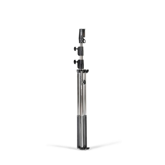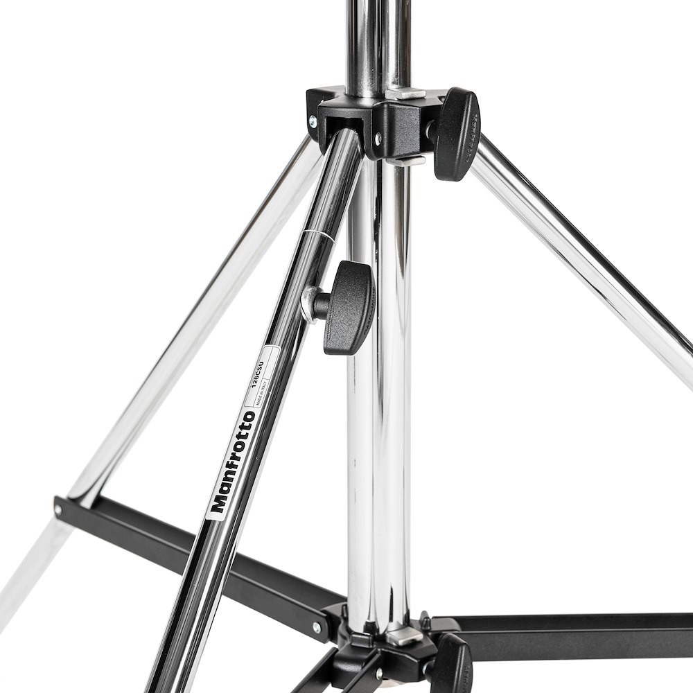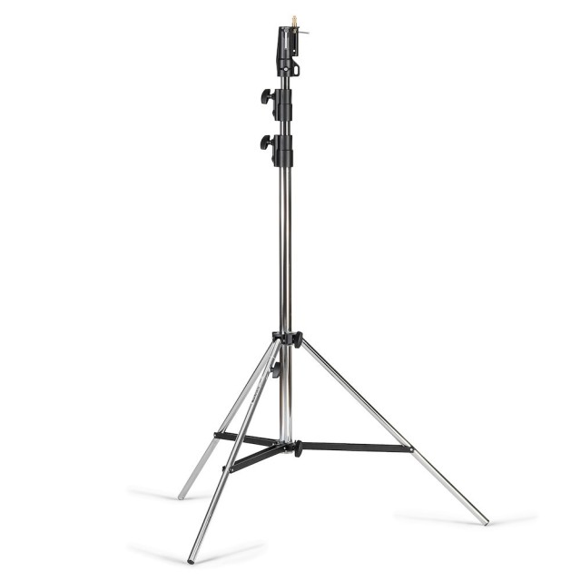 Manfrotto 126CSU (čierna chrómová povrchová úprava) je jeden z najpevnejších oceľových stojanov bez vzduchového vankúša v ponuke Manfrotto/Avenger. Je vyrobený výlučne z chrómovanej ocele s dvojitým vyztužením nôh a širokou základňou 131 cm, vďaka čomu poskytuje výnimočnú stabilitu aj pri plnej výške 333 cm. Vynikajúcou vlastnosťou je maximálna nosnosť 40 kg (3 kg pri plnom vysunutí) v kombinácii s integrovanou vyrovnávacou nohou, ktorá udržuje stojan v dokonale vertikálnej polohe aj na nerovnom teréne. Univerzálna hlava typu 14 ponúka 28 mm junior ženský prijímač, 16 mm baby čap a 3/8" závit, vďaka čomu je kompatibilná s prakticky všetkými profesionálnymi osvetľovacími zariadeniami. Pre ľahkú mobilitu v štúdiu je možné pridať voliteľné sady koliesok 109/110/110G.