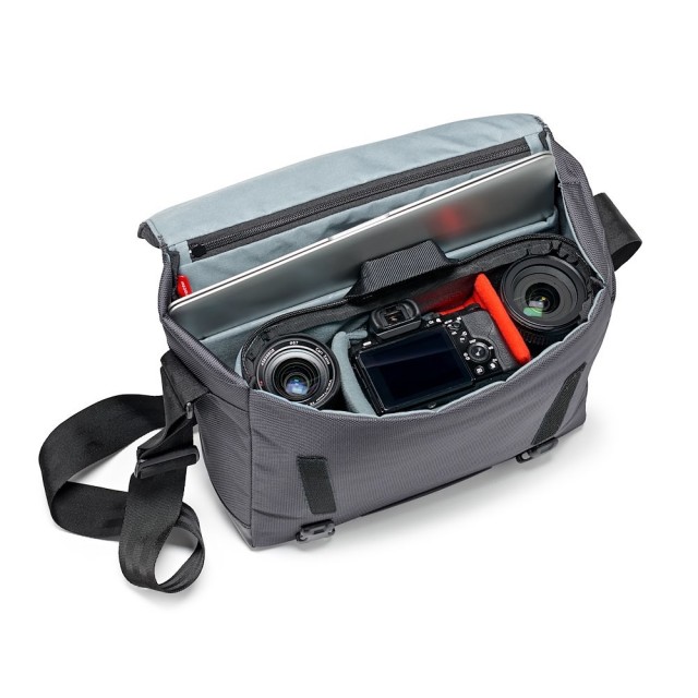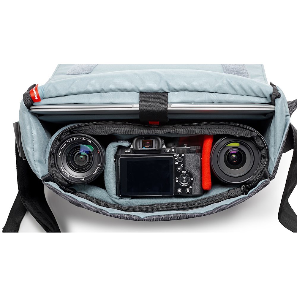 Manfrotto MB MN-M-SD-10 Manhattan Speedy-10 Messenger je 880 g sivá mestská taška z balistického nylonu s odnímateľnou vložkou Flexy Camera Shell (26 × 10 × 19 cm), 12-palcovým puzdrom na notebook, skrytou klopou na statív, stabilizačným popruhom a vodoodpudivou vrstvou – vhodná pre prémiové CSC (A7II + 2 objektívy) alebo DJI Mavic súpravy na každodenné dochádzanie do práce alebo fotografovanie v meste.