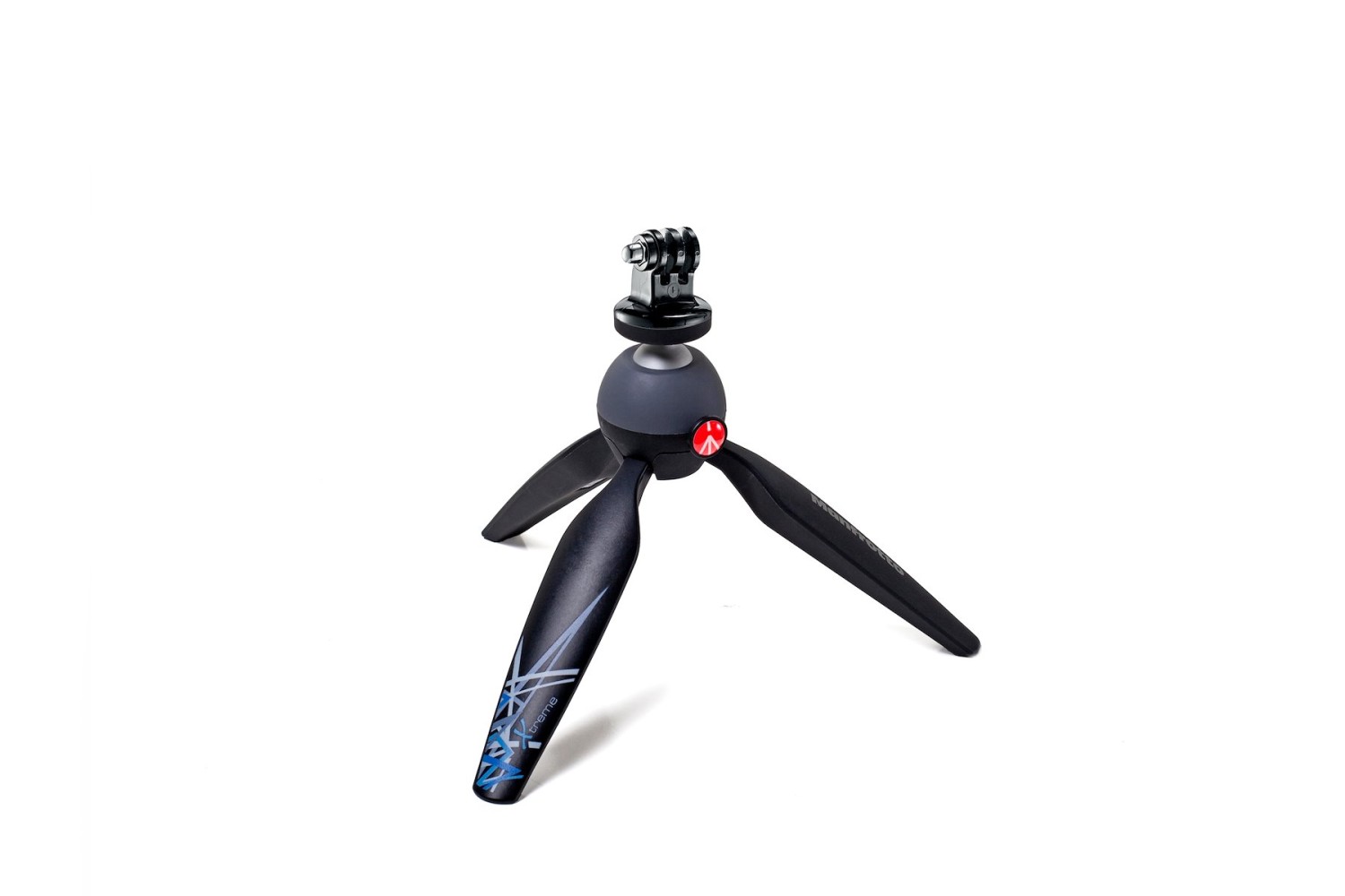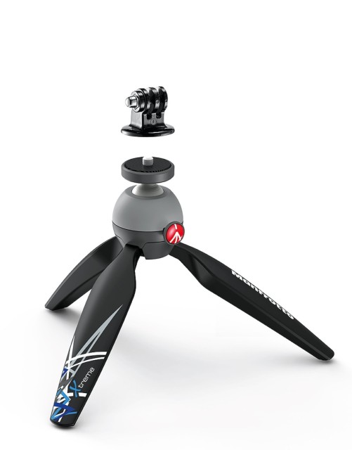Stativ Manfrotto PIXI Xtreme Mini s adaptérom GoPro: Ultraprenosný stolný/ručný stativ s priemerom 6,3" s guľovou hlavou s tlačidlom, skrutkou 1/4"-20, gumovými nožičkami a špeciálnym držiakom GoPro – unesie 1 kg v balení z nehrdzavejúcej ocele/Adapto s hmotnosťou 195 g.