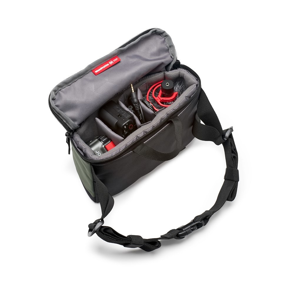 Taška Manfrotto Street Waist Bag sa dá premeniť z tašky na opasok na tašku cez rameno pomocou 4 cm širokého, dvojito nastaviteľného popruhu s pevnou rýchloupínacou prackou. Hlavné vrecko na zips sa otvára zhora nadol, čo umožňuje okamžitý prístup k vybaveniu, zatiaľ čo odnímateľná polstrovaná vložka s pohyblivými priečkami pojme CSC (A6400, EOS M50) s objektívom zo sady a jedným pevným objektívom alebo vlogovú výbavu s mikrofónom/LED. Vložku môžete vybrať a získať tak 2-litrové vrecko na telefón, peňaženku a kľúče. S hmotnosťou len 300 g je to ideálne riešenie pre fotografov na ulici, dochádzajúcich alebo pilotov dronov, ktorí potrebujú rýchle a flexibilné prenášanie.