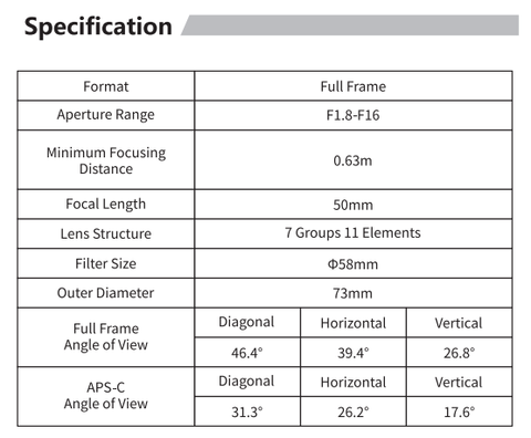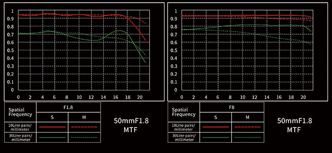 Úplne nový objektív 50 mm/F1,8 využíva najnovšiu optickú konštrukciu, vďaka ktorej je schopný dosiahnuť veľkú svetelnosť F1,8 pri zachovaní miniatúrnosti a nízkej hmotnosti. Na oboch stranách objektívu je použitá technológia viacvrstvovej povrchovej úpravy, ktorá obnovuje realistickejšie farby. Na objektíve sa ľahko neprichytáva prach ani škvrny a dá sa ľahko utrieť.