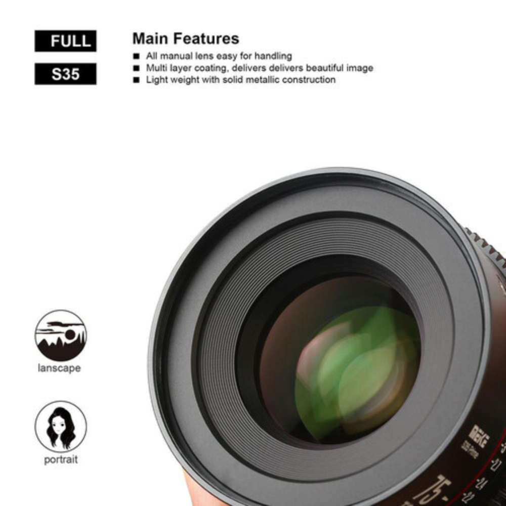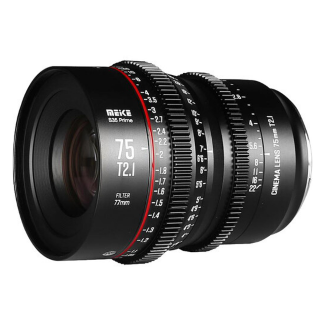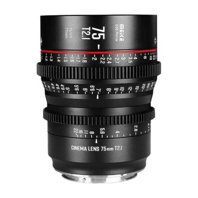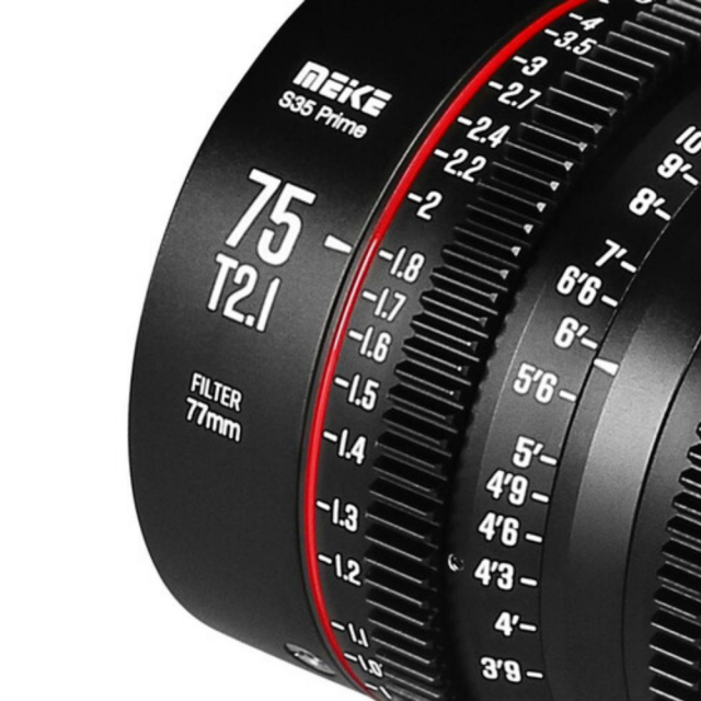 Tretí kinofilmový objektív Meike v sérii Super35-Prime Cine Lens: Meike 75 mm T2.1. Tento objektív s obrazovým kruhom 33,6 mm je kompatibilný s fotoaparátmi Super 35 a bude k dispozícii v dvoch bajonetoch, PL/EF.Tento objektív je jedným z kinofilmových objektívov Meike v novej sérii Super35-Prime Cine Lens Series.Má štandardné 0,8 mm ozubené kolieska na zaostrovacom a clonovom krúžku.
