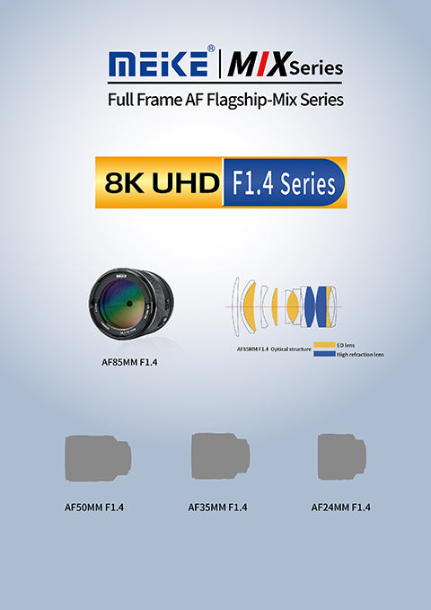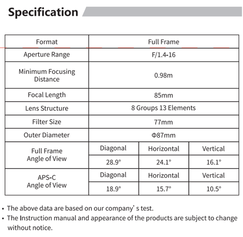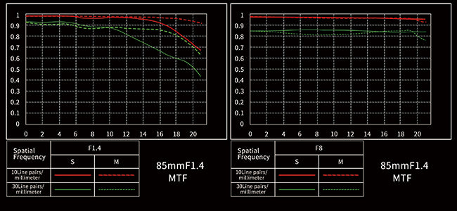 85 mm f/1,4 je objektív na portrétne snímanie s vysokým rozlíšením, ktorý dokáže dosiahnuť vysoké rozlíšenie obrazu pri zaostrení a jemné rozostrenie pozadia mimo zaostrenia, čím poskytuje jasný obraz na každodenné snímanie. Objektív sa ľahko prenáša a jeho snímky sú ostré a jasné pri akejkoľvek clone.