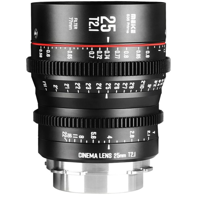 Stýmto objektívom 25 mm T2.1 Super35 Prime Cine od spoločnosti Meike s bajonetom EF zachytíte ostré filmové zábery pri použití filmovej kamery. Tento 25 mm základný objektív dopĺňa sériu objektívov Meike, ktoré majú 33,6 mm obrazový kruh na pokrytie snímača Super35 mm. Tento základný objektív má rýchlu maximálnu clonu T2,1, štandardné zaostrovacie a clonové prevody 0,8 MOD a clonu s 9 lamelami pre hladký, zaoblený bokeh.