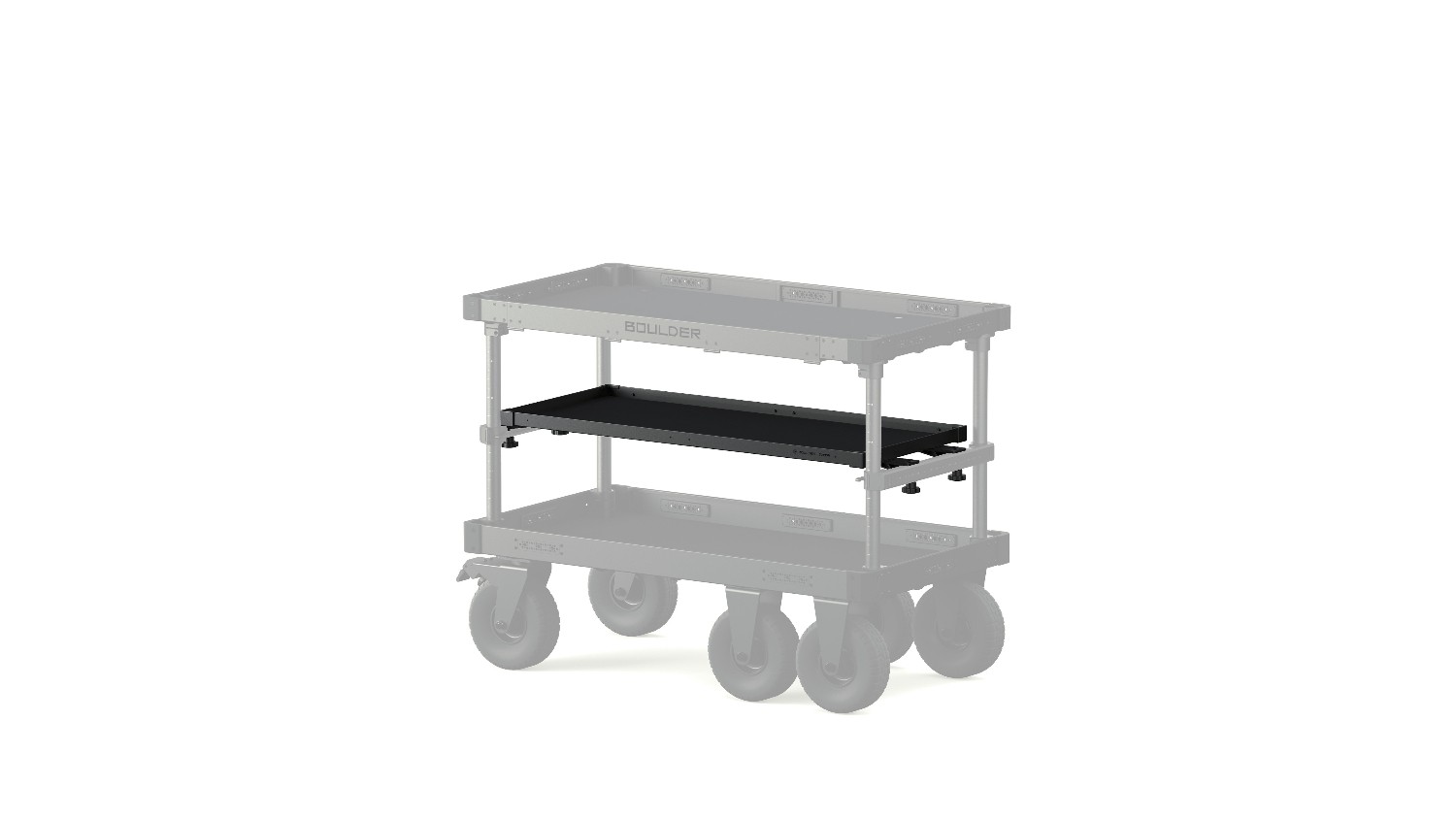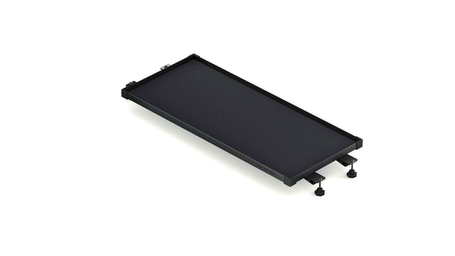 Keď je podnos umiestnený vyššie, funguje ako tenká, praktická polica – ideálna na ukladanie nástrojov, batérií, káblov alebo menších komponentov – pričom pod ním zostáva dostatok voľného priestoru na väčšie kufre a vybavenie. Podnos je vyrobený z vysoko pevnej hliníkovej zliatiny a má elegantnú čiernu povrchovú úpravu. Je ľahký, ale zároveň dostatočne odolný pre náročné produkčné prostredia.