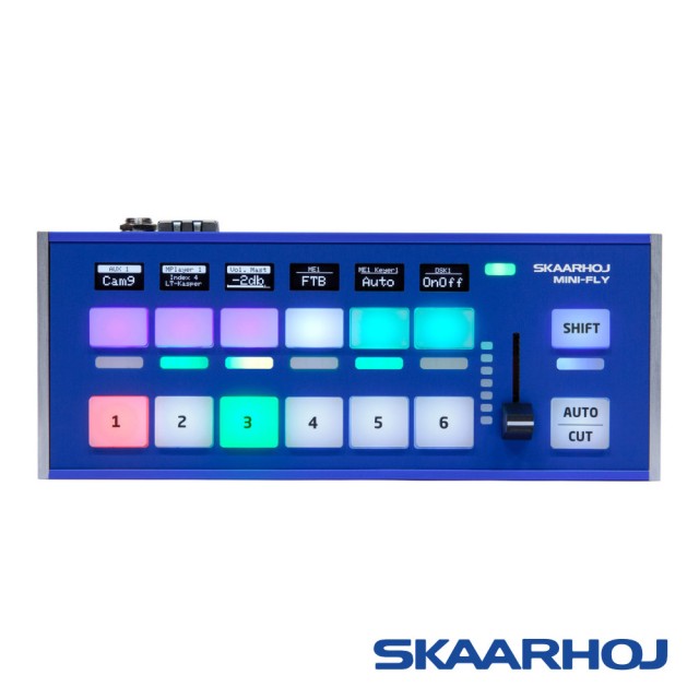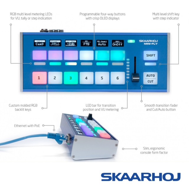 Kompaktný a flexibilný ovládací panel Skaarhoj Mini Fly je určený na pohodlné ovládanie režijných kamier (vrátane Blackmagic Design ATEM, vMix a mnohých ďalších) pre menšie produkcie do 6 kamier. Napriek malým rozmerom ponúka displej OLED podsvietené štítky a tlačidlá RGB, náhľad úrovne zvuku/stav prelínania, šabľu na ovládanie efektov prelínania, závit 1/4"-20 na spodnej strane na voliteľnú pevnú montáž, rozhranie Ethernet vrátane. PoE (IEEE802.3af) atď.