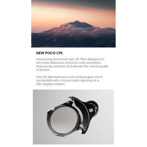 Filter MOFAGE Circular-Polarizing (CPL) je prémiový filter určený pre systém POCO Adapter, ktorý ponúka bezkonkurenčnú kontrolu nad odrazmi a farbami. Je vybavený kinematografickým štandardným modulom0,8 pre presné motorizované otáčanieo 360°, čo umožňuje kameramanom diaľkovo eliminovať odrazy, prehĺbiť kontrast oblohy a maximalizovať sýtosť farieb.