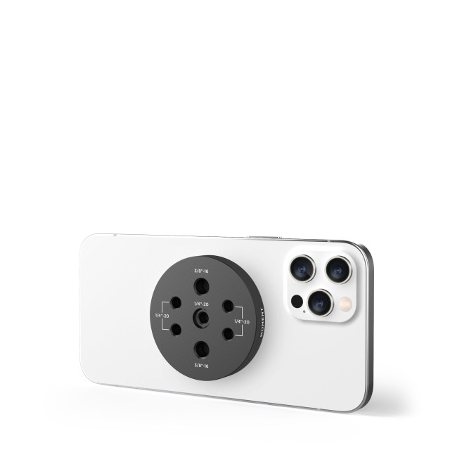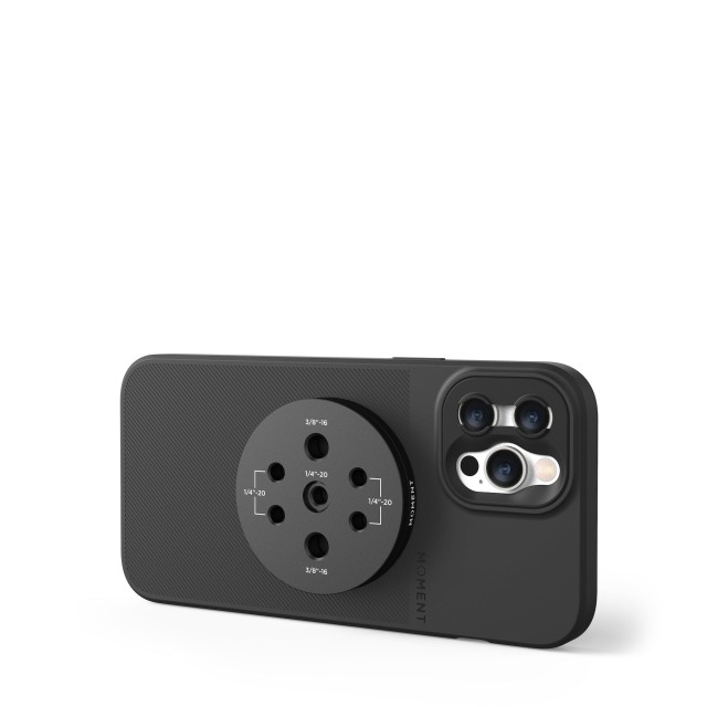 Predstavujeme držiak s viacerými závitmi - pre MagSafe®... alias syrovú dosku s piatimi vnútornými závitmi na jednej strane a mimoriadne silnými magnetmi na druhej strane... ktorá bezpečne pripevní iPhone s MagSafe k čomukoľvek. Vytvorili ho filmári zo spoločnosti Moment a ide o prvý držiak kompatibilný so systémom MagSafe, ktorý obsahuje (2) 3/8" vnútorné závity a (3) 1/4"-20 vnútorné závity. Umožňuje vám pripevniť telefón kamkoľvek chcete pomocou akéhokoľvek príslušenstva 1/4"-20 alebo 3/8". Magické ramená, statívy, držiaky na zariadenia, guľové hlavy, čokoľvek si spomeniete... viaczávitový držiak Moment vám umožní pripevniť k nemu telefón pomocou magnetov. Tento držiak je použiteľný s puzdrom alebo bez neho a obsahuje aj patentovanú sústavu magnetov (M)Force, ktorá je ešte silnejšia ako štandardné príslušenstvo, čo vám dáva väčšiu istotu, že telefón nespadne.