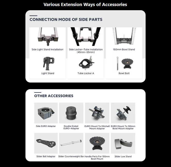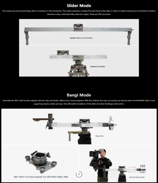Systém MOVMAX Slider, vyvinutý pre potreby profesionálnej filmovej produkcie, ponúka výnimočnú stabilitu a plynulý pohyb v rôznych dĺžkach – 60 cm, 90 cm, 120 cm, 150 cm, 180 cm a 210 cm – vďaka čomu je ideálny pre širokú škálu natáčacích scenárov. Kĺzavý vozík podporuje upevnenia Mitchell, 100 mm a 150 mm, čo v kombinácii s 360° adaptérom umožňuje multifunkčné použitie v rozsahu 360°. Jeho režim Double Mode umožňuje plynulé prepínanie medzi režimom Slider Mode, ktorý sa vyznačuje ultrapresnými CNC obrábanými hliníkovými, oceľovými a medenými komponentmi pre plynulý pohyb, a režimom Bangi Mode, ktorý prispôsobuje slider na použitie so statívmi, vozíkmi alebo rigmi prostredníctvom adaptérov Euro-mount. Je vyrobený z vysoko pevnej hliníkovej zliatiny leteckej kvality série 7, ktorá ponúka odolnosť, tuhosť a konzistentný výkon. Režim bočného rozšírenia umožňuje montáž na svetelné stojany, apple boxy alebo euroadaptéry pre univerzálne nastavenia. MOVMAX Slider je profesionálny nástroj navrhnutý tak, aby poskytoval presný, filmový pohyb v akomkoľvek produkčnom prostredí.
