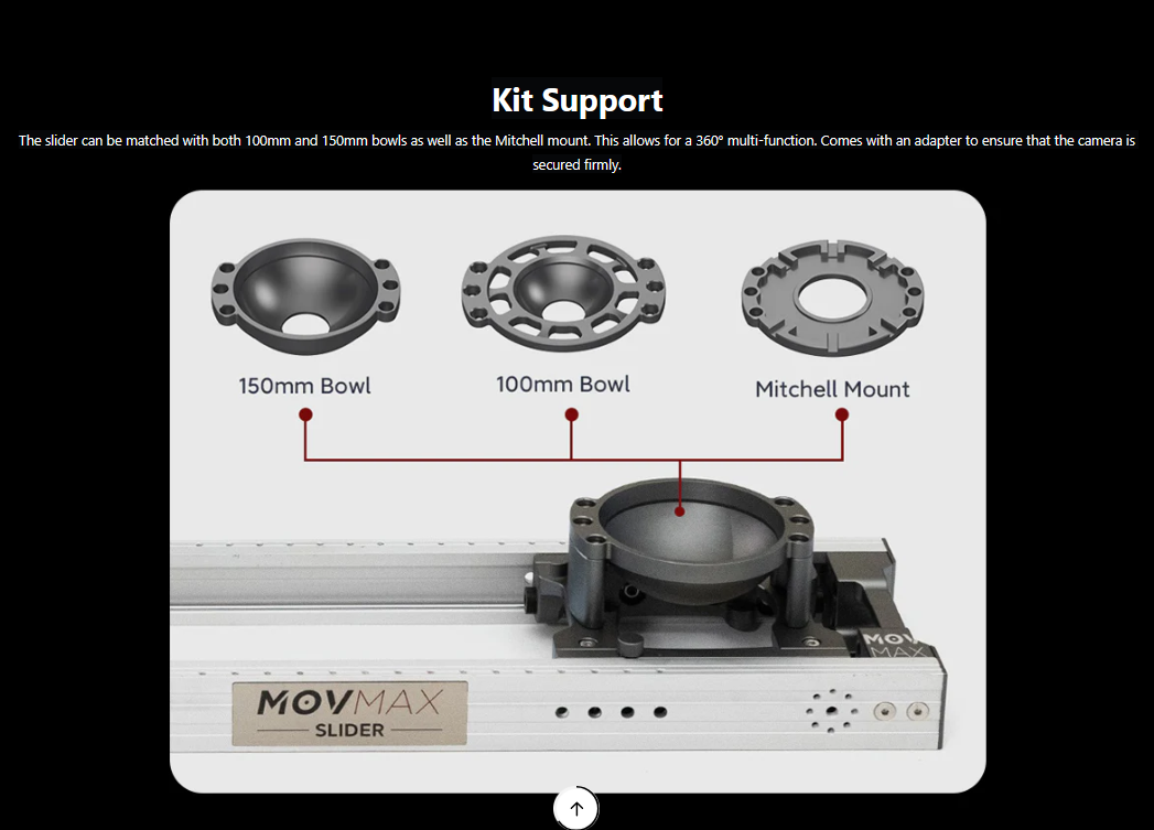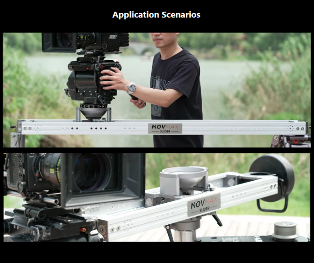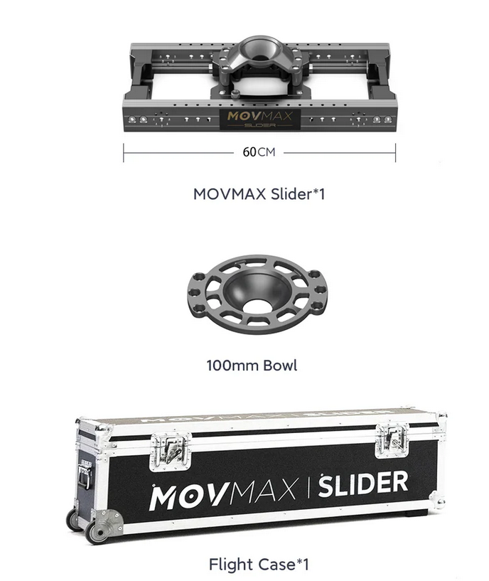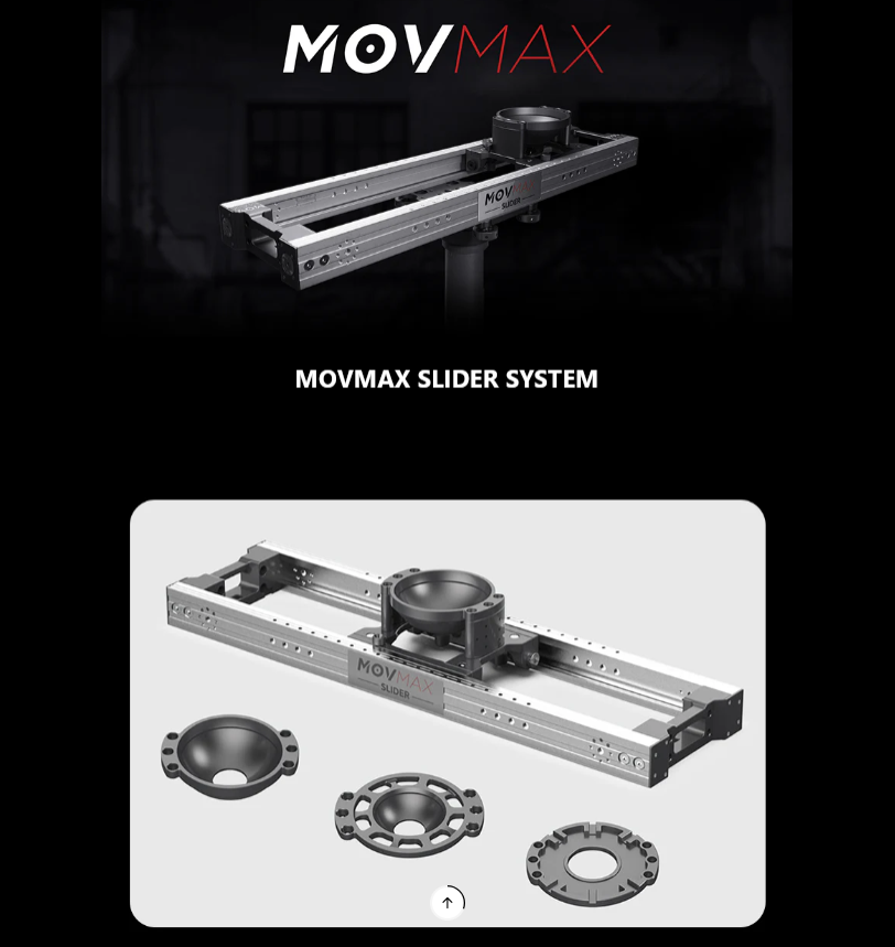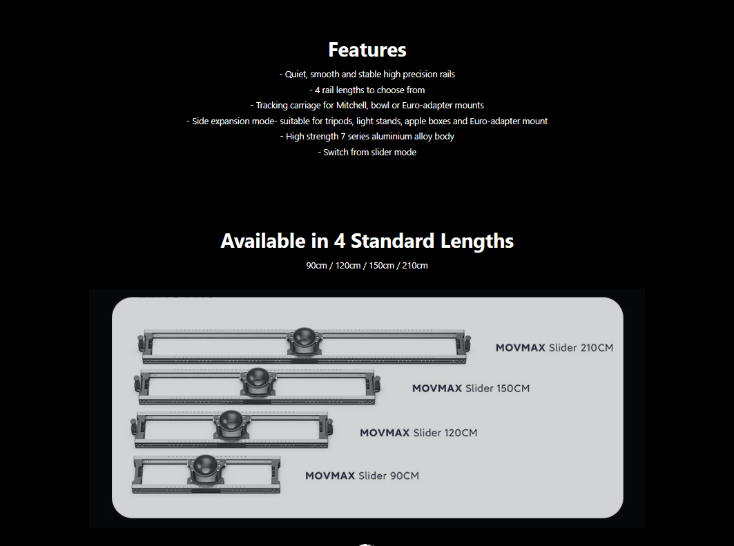 Systém MOVMAX Slider je presne navrhnutý kamerový posúvač určený pre profesionálnu kinematografiu, ktorý je k dispozícii v dĺžkach 60 cm, 90 cm, 120 cm, 150 cm, 180 cm a 210 cm. Je vybavený tichými, hladkými a vysoko presnými koľajnicami, režimom bočného rozšírenia pre použitie so statívmi alebo svetelnými stojanmi a kompatibilitou s 100 mm/150 mm misovými držiakmi alebo držiakmi Mitchell, všetko postavené na robustnom tele z hliníkovej zliatiny série 7.