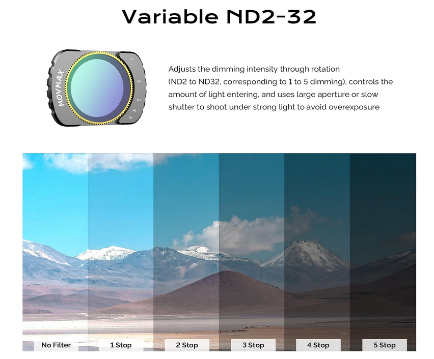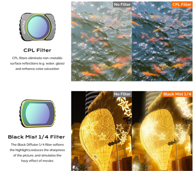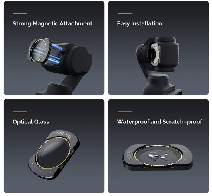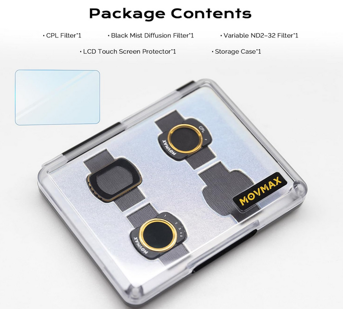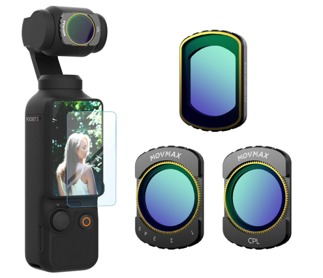 Súprava magnetických filtrov MOVMAX pre DJI Osmo Pocket 3 Creator Combo obsahuje variabilný filter ND2-32 (1–5 stupňov), otočný filter CPL a difúzny filter Black Mist 1/4 – všetky sa magneticky pripínajú pre okamžité použitie – plus ochrannú fóliu na LCD displej, ktorá poskytuje filmovú kontrolu, jas bez odleskov a snové efekty zjemňujúce pleť v dynamickom osvetlení bez potreby prekalibrovania gimbalu.