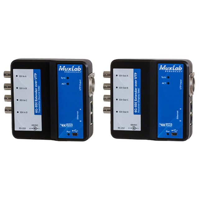 Rozšírenie 6G-SDI cez UTP je jedinečné riešenie spoločnosti MuxLab na rozšírenie rozsahu výstupov SDI z kamier alebo iných zdrojov videa SDI s rozlíšením až 4K na vzdialenosť až 100 pomocou káblov Cat5e/6 UTP. Extender podporuje prenosové rýchlosti až do 6 Gb/s a umožňuje kombinovať rôzne zdroje videa, napr. jeden 6G-SDI, dva 3G-SDI alebo štyri zdroje HD-SDI. K dispozícii sú aj dva ethernetové kanály v režime Return (monitorovanie, spätný hovor) a priechodné rozhrania RS-232 (tally, CCU atď.). 6G-SDI Extender podporuje napájanie PoE (vysielač môže byť napájaný prijímačom). Ethernetový port1 ponúka aj PoE na napájanie napr. pripojeného MuxLab Over IP PoE TX alebo RX. Súprava vysielača a prijímača.