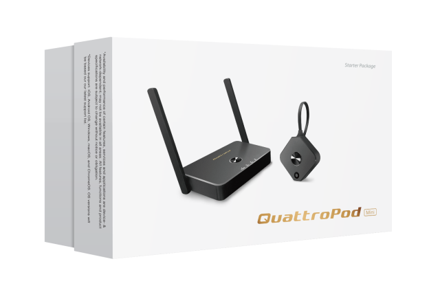 NimbleTech QuattroPod Mini 1T1R je kompaktný, vysoko výkonný bezdrôtový prezentačný systém s prijímačom 4K a jedným vysielačom HDMI na bezproblémové zdieľanie obrazovky na stretnutiach, v triedach a na spoločných pracoviskách.