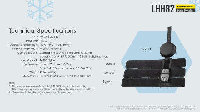 Vyhrievaná clona objektívu je nevyhnutným príslušenstvom pri fotografovaní pri nízkych teplotách a/alebo v prostredí s vysokou vlhkosťou, kde je nevyhnutnou ochranou pred zahmlievaním objektívu. Úplne obklopuje objektív (s priemerom filtra približne 72 ~ 82 mm) a poskytuje tak maximálnu tepelnú ochranu zahriatím na približne 45 °C (teplota sa dosiahne približne za 10 - 15 minút). Nylonový kryt odoláva teplotám -40-40 °C a je vybavený rozhraním USB-C na napájanie (max. 5 V/2 A) pomocou externých napájacích zdrojov vrátane batérií (nie sú súčasťou dodávky) a dodávaným 1,5 m káblom USB-A/USB-C s lomenými konektormi, ktorý odoláva teplotám pod bodom mrazu až do -20 °C. Ideálne príslušenstvo pre dokumentárne súbory, astrofotografiu atď.!