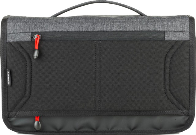 Zadná strana tašky obsahuje vrecko na zips, ktoré možno v spodnej časti otvoriť a pretiahnuť tadiaľto rukoväť vozíka, čo je praktické pri cestovaní.