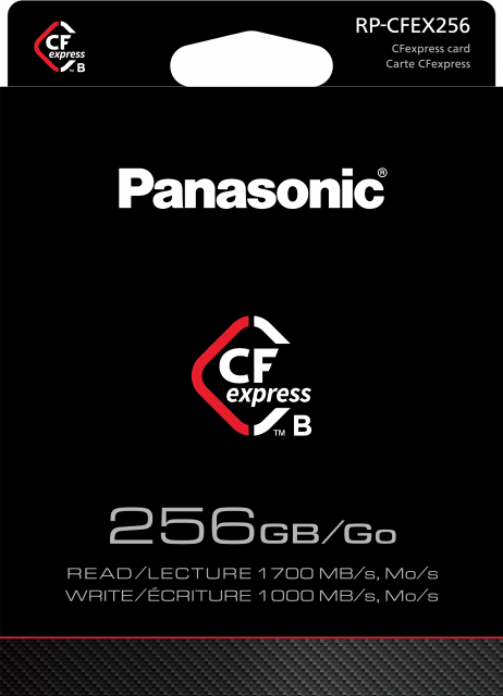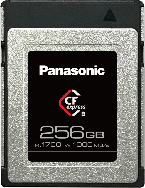 Profesionálna karta CFexpress 256 GB od spoločnosti Panasonic s vysokou rýchlosťou čítania/zápisu určená na dlhodobé používanie a bezpečné nahrávanie.