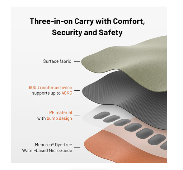 Podšívka z TPE s výstupkami zvyšuje pohodlie pri dlhodobom používaní a zabraňuje namáhaniu krku alebo ramien. Tento popruh je ľahký, váži len 70 g, je vyrobený z priedušného ekologického vystuženého nylonu 600D a má štýlovú povrchovú úpravu Earth Brown. Spája bezpečnosť, pohodlie a estetiku pre fotografov, ktorí sú často na cestách.