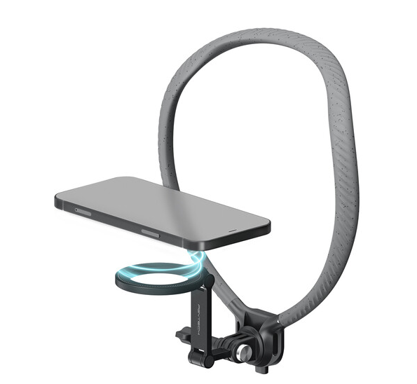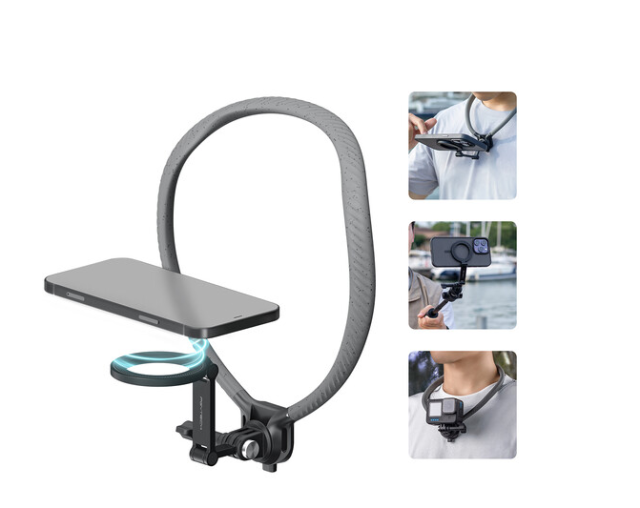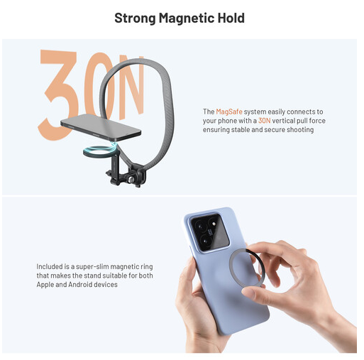 Držiak je vybavený magnetickým rýchloupínacím systémom CapLock, ktorý bezpečne drží smartfóny s MagSafe alebo magnetickými upevňovacími krúžkami a umožňuje rýchle pripevnenie alebo odstránenie. Kĺbové rameno sa pevne zafixuje do polohy pre presné rámovanie. Pre väčšiu univerzálnosť je súčasťou balenia aj držiak pre akčnú kameru, vďaka čomu je kompatibilný s kompaktnými kamerami, ako sú modely GoPro a DJI.