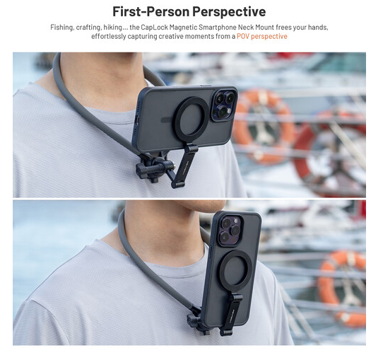 Zaznamenávajte pôsobivé zábery z vlastnej perspektívy bez použitia rúk vďaka magnetickému držiaku na krk PGYTECH CapLock pre smartfóny, ktorý je vybavený nastaviteľnou trubicou na krk, kompatibilitou s MagSafe a bezpečným magnetickým dizajnom s rýchlym uvoľnením.