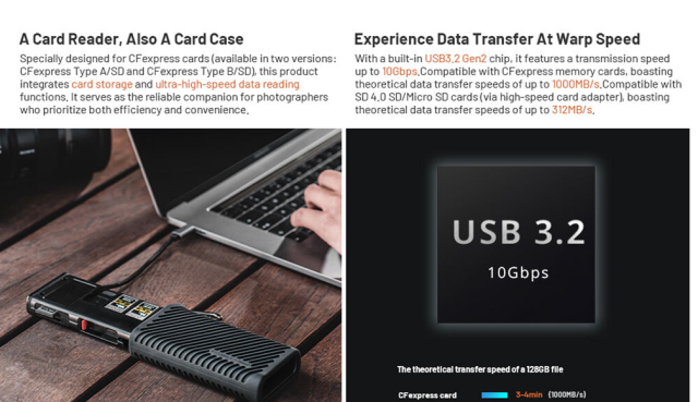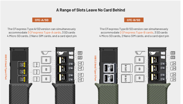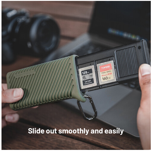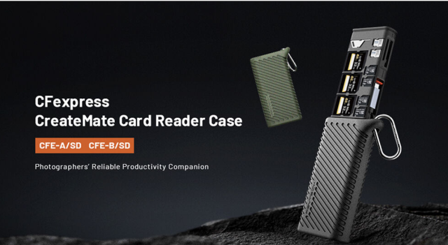 Dvojité slotové karty umožňujú čítať karty CFexpress typu B a UHS-II SD (po jednej), zatiaľ čo priložený adaptér microSD na SD zvyšuje univerzálnosť. Pomocný napájací port USB-C (5 V/2 A) zaisťuje stabilný a konzistentný prenos dát, zatiaľ čo konštrukcia s krytím IP54 chráni pred prachom, nečistotami a striekajúcou vodou. Puzdro je tiež vybavené karabínou pre jednoduché pripevnenie k taške alebo popruhu a multifunkčným vyhadzovacím kolíkom pre jednoduché vyberanie kariet. Jeho kompatibilita plug-and-play zahŕňa Windows 7+, macOS 10.6+, Linux, Android a iPadOS, čo z neho robí ideálneho spoločníka pre fotoaparáty, drony, akčné kamery a smartfóny.