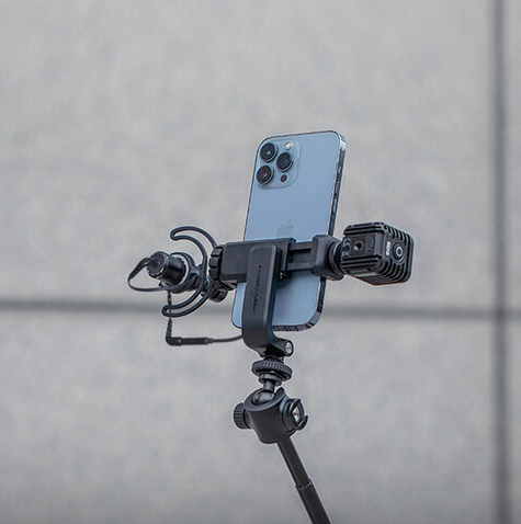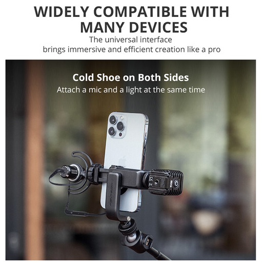 Na zvýšenie kvality produkcie obsahuje svorka dve vstavané studené pätice – jednu na hornej a jednu na spodnej strane – ideálne na pripevnenie voliteľného príslušenstva, ako sú mikrofóny, LED svetlá alebo bezdrôtové prijímače. Kompaktný a ľahko použiteľný, tento držiak je praktickým nástrojom pre profesionálne aj bežné nastavenia snímania smartfónom.