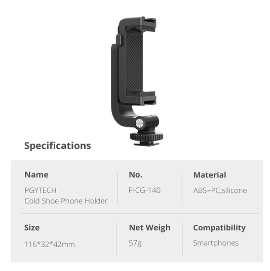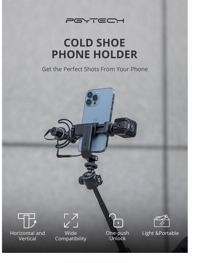 Držiak PGYTECH Smartphone Cold Shoe Tripod Mount (P-CG-140) je univerzálne riešenie pre tvorcov mobilného obsahu, vlogerov a livestreamerov. Je navrhnutý pre smartfóny s šírkou od 2,4 do 3,6 palca a vaše zariadenie bezpečne upevní pomocou praktického mechanizmu s tlačidlom pre rýchle vloženie a vyberanie.