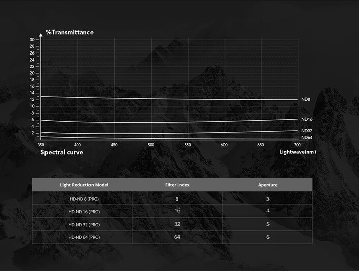 Štyri ND filtre: ND8 (3 f-stopy), ND16 (4 f-stopy), ND32 (5 f-stopy), ND64 (6 f-stopy)