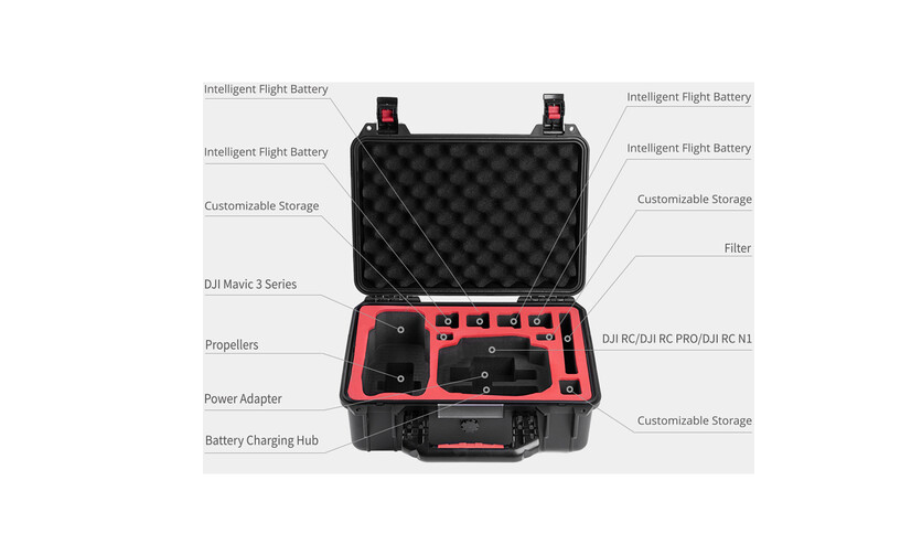 Puzdro je vybavené predrezanými penovými vložkami s prispôsobenými priehradkami na bezpečné uloženie dronu, diaľkového ovládača, batérií a ďalšieho nevyhnutného príslušenstva. Vnútorné polstrované veko poskytuje dodatočné odpruženie pre citlivé zariadenia. Integrovaný ventil na uvoľnenie tlaku zaisťuje bezpečné nastavenie tlaku vzduchu počas leteckej dopravy. Robustné zapínanie na zámok umožňuje pripevnenie visiaceho zámku (nie je súčasťou balenia) pre väčšiu bezpečnosť. Toto ľahké, ale odolné puzdro s tvrdou škrupinou je navrhnuté tak, aby odolalo náročným podmienkam a zároveň udržalo vaše vybavenie usporiadané a chránené.