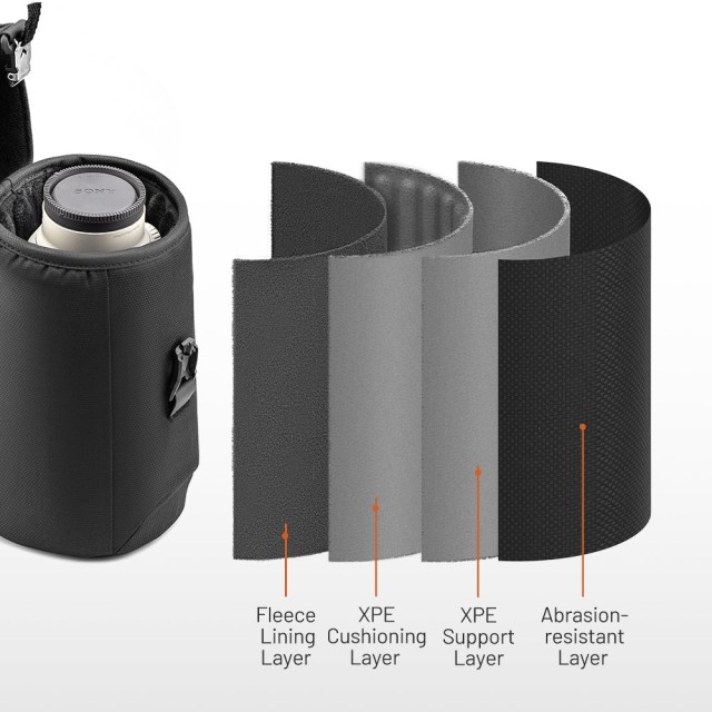 Vonkajšia časť je vyrobená z odolnej tkaniny, ktorá odoláva striekajúcej vode a prachu. Špeciálny zips so zvýšenou odolnosťou proti poveternostným vplyvom zabraňuje prenikaniu vlhkosti. Vnútri sa nachádzapodšívka z pamäťovej peny, ktorá sa prispôsobí tvaru objektívu, absorbuje nárazy a zabraňuje poškriabaniu aj pri častom používaní.