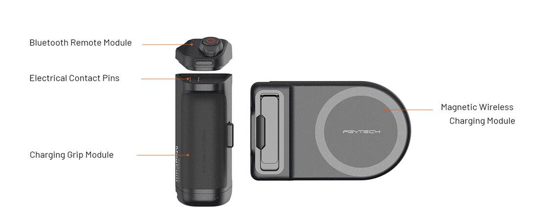 Modulárna konštrukcia vám umožňuje premeniť držiak na stojan pre živé vysielanie, tvorbu obsahu alebo používanie bez použitia rúk. Multifunkčný modul ovládania uzávierky funguje ako bezdrôtové diaľkové ovládanie Bluetooth s dosahom 10 m, ktoré umožňuje spúšťať/zastavovať video, fotografovať, približovať a upravovať nastavenia bez dotyku telefónu.