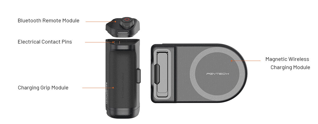 Modul nabíjacieho držadla obsahuje nabíjateľnú lítium-iónovú batériu s kapacitou 3000 mAh, ktorá bezdrôtovo nabíja telefón prostredníctvom magnetického držiaka a funguje aj ako powerbanka pre dlhšie fotografovanie. LED indikátor stavu napájania vás informuje o zostávajúcej výdrži batérie. Obojstranný magnetický dizajn umožňuje pripojiť ďalšie príslušenstvo, ako napríklad LED svetlo, pre rozšírené kreatívne nastavenia.