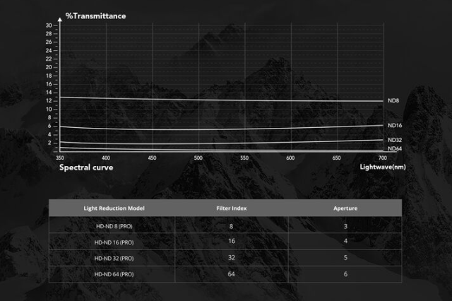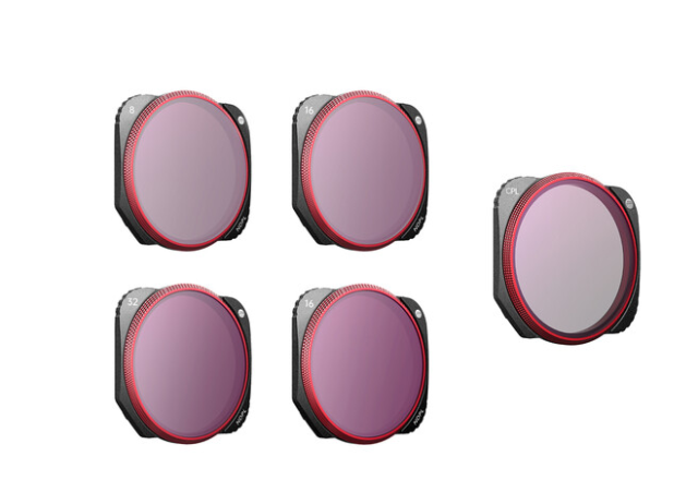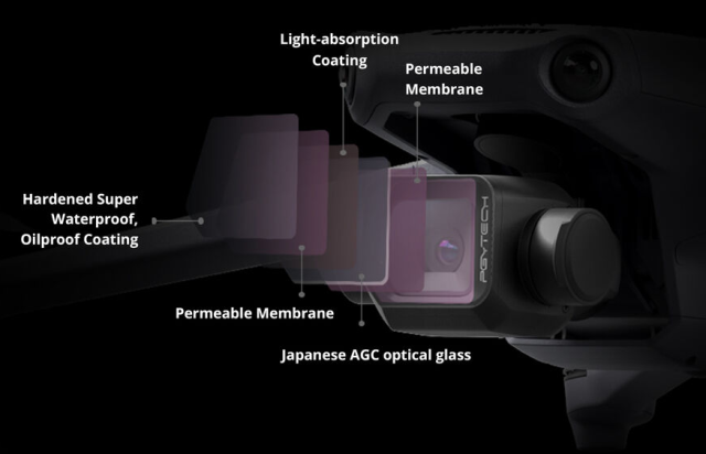 Každý filter je vyrobený z dvojito potiahnutého japonského optického skla AGC, je brúsený a leštený pre nízky index lomu, čím zabezpečuje presnú reprodukciu farieb a ostrý obraz pre fotografie aj videá. Vodotesné, olejovzdorné a odolné proti poškriabaniu povlaky chránia sklo v náročných letových podmienkach. Filtre sú umiestnené v ľahkom hliníkovom ráme vyrobenom technológiou CNC, sú odolné proti korózii a presne navrhnuté tak, aby počas letu udržiavali správnu rovnováhu gimbalu.